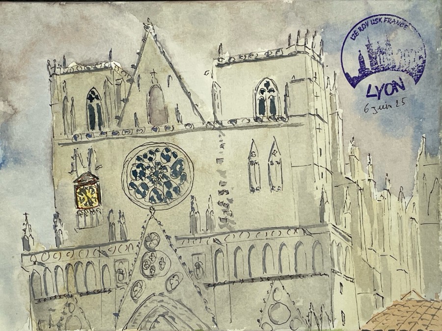 Après un pique-nique au bord de la Saône, j’ai dessiné la cathédrale Saint-Jean au premier plan et, plus haut sur la colline, la basilique de Fourvière.