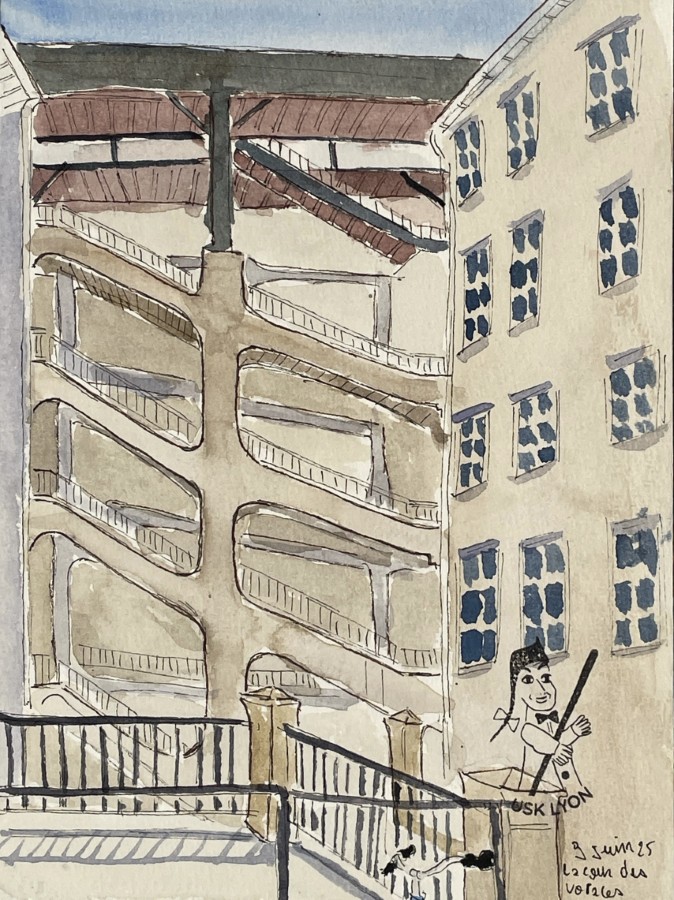 Dernier jour, j’ai pu découvrir le quartier de la Croix-Rousse, perché sur les hauteurs de Lyon. Avec ses ruelles en pente, ses murs colorés et ses célèbres traboules — ces passages étroits qui traversent les immeubles et les cours intérieures — le quartier révèle un charme unique. Autrefois empruntées par les canuts, les ouvriers tisseurs de soie, pour transporter la soie à l’abri, ces traboules offrent aujourd’hui un terrain idéal pour flâner et croquer l’ambiance singulière de la ville.