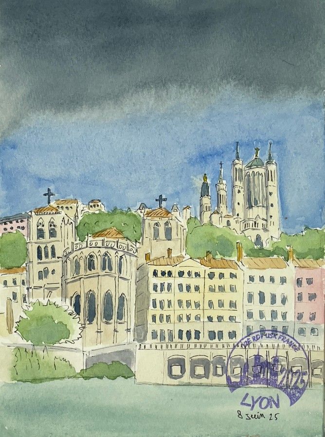 Après un pique-nique au bord de la Saône, j’ai dessiné la cathédrale Saint-Jean au premier plan et, plus haut sur la colline, la basilique de Fourvière.